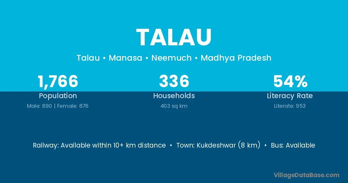 Kukdeshwar (8 km) is the nearest town to Talau village for major economic activities and is located approximately 8 km away.