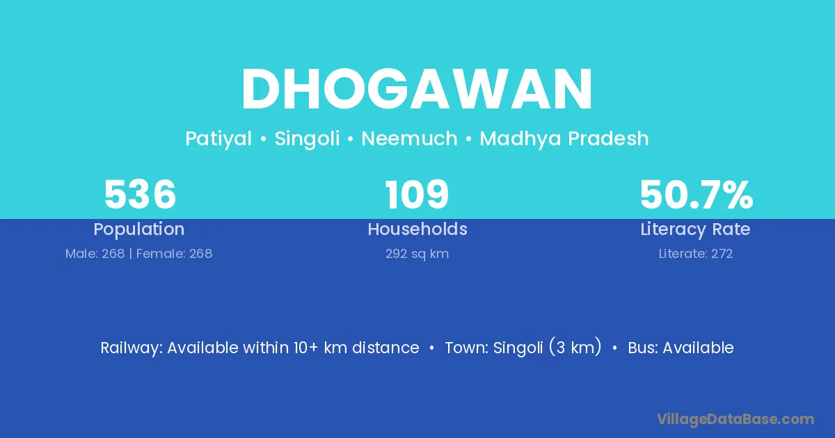 Singoli (3 km) is the nearest town to Dhogawan village for major economic activities and is located approximately 3 km away.