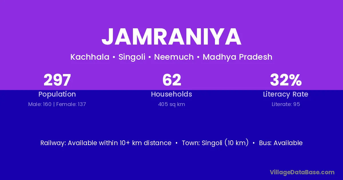 Singoli (10 km) is the nearest town to Jamraniya village for major economic activities and is located approximately 10 km away.