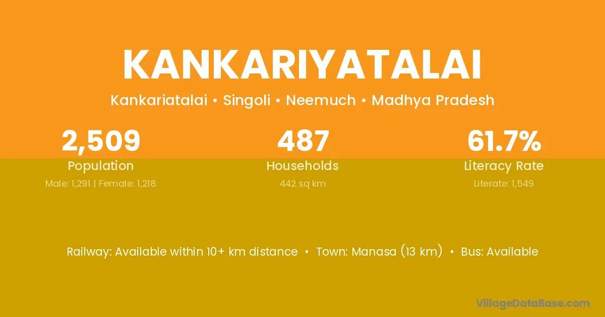 Manasa (13 km) is the nearest town to Kankariyatalai village for major economic activities and is located approximately 13 km away.