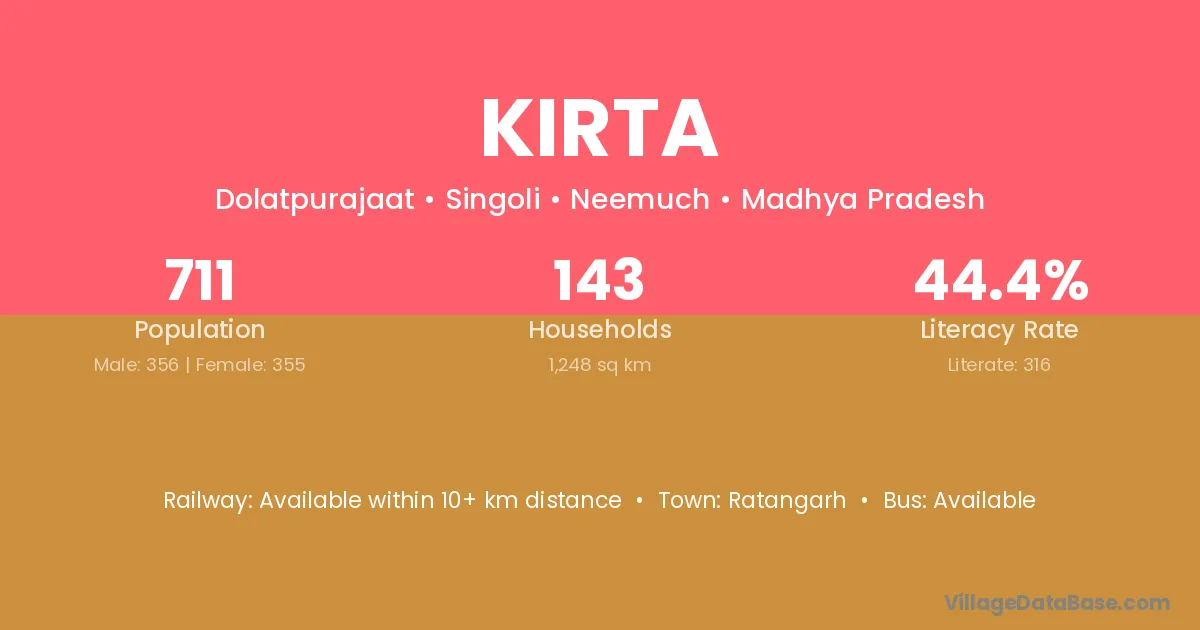 Kirta village has a total population of 711 people, of which 356 are males and 355 are females.