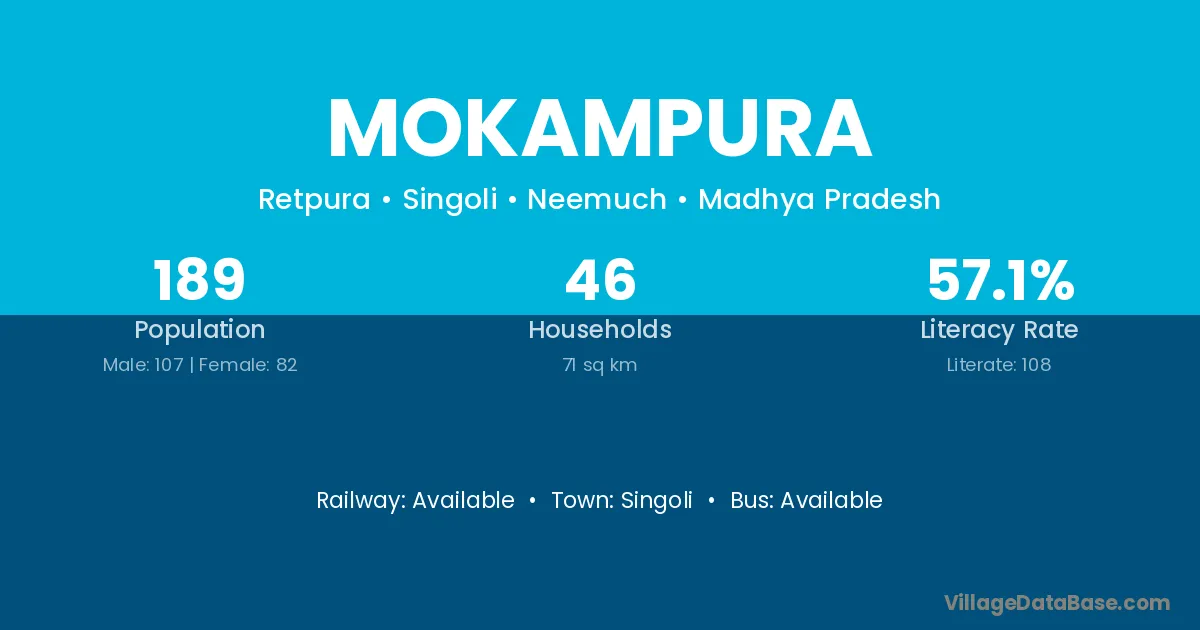 Mokampura village has a total population of 189 people, of which 107 are males and 82 are females.