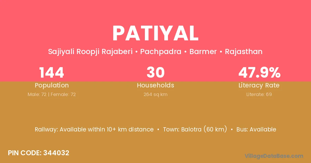 The literacy rate of Patiyal village is 60.94%. Male literacy stands at 80.09% and female literacy at 40.33%.