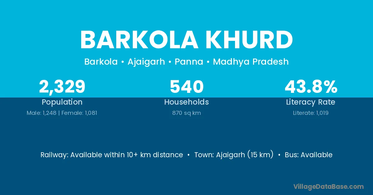 Ajaigarh (15 km) is the nearest town to Barkola Khurd village for major economic activities and is located approximately 15 km away.