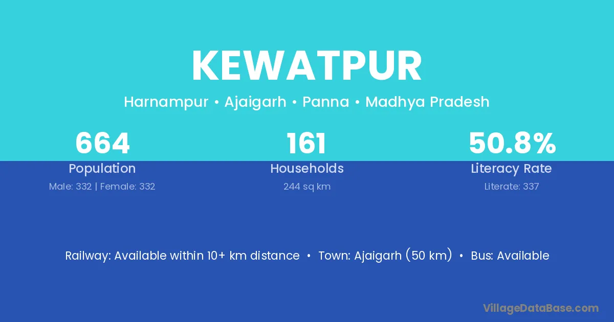 Ajaigarh (50 km) is the nearest town to Kewatpur village for major economic activities and is located approximately 50 km away.