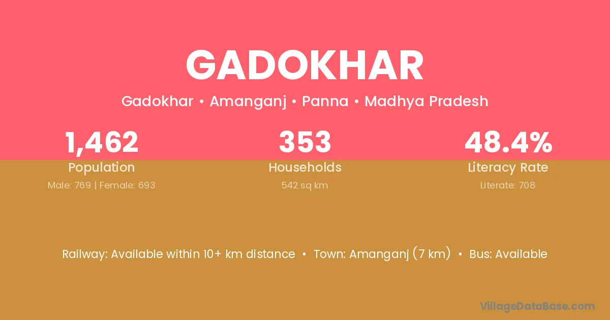 Gadokhar village has a total population of 1,462 people, of which 769 are males and 693 are females.
