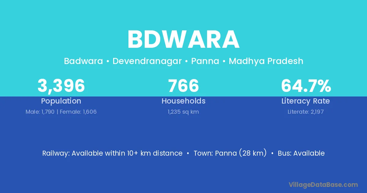 Panna (28 km) is the nearest town to Bdwara village for major economic activities and is located approximately 28 km away.