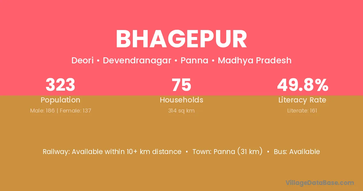 Panna (31 km) is the nearest town to Bhagepur village for major economic activities and is located approximately 31 km away.