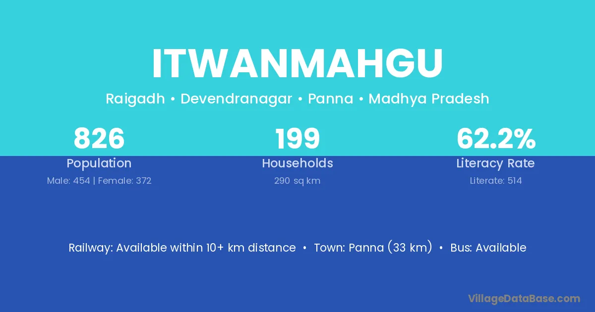 Panna (33 km) is the nearest town to Itwanmahgu village for major economic activities and is located approximately 33 km away.