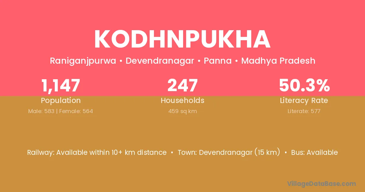 Kodhnpukha village has a total population of 1,147 people, of which 583 are males and 564 are females.