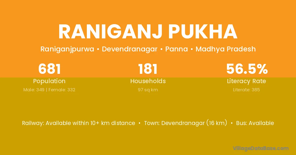 Raniganj Pukha village has a total population of 681 people, of which 349 are males and 332 are females.