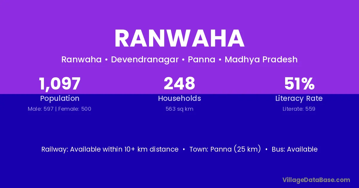 Panna (25 km) is the nearest town to Ranwaha village for major economic activities and is located approximately 25 km away.