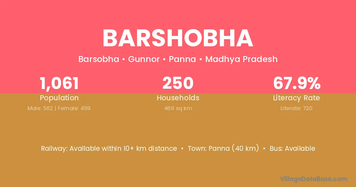 Panna (40 km) is the nearest town to Barshobha village for major economic activities and is located approximately 40 km away.