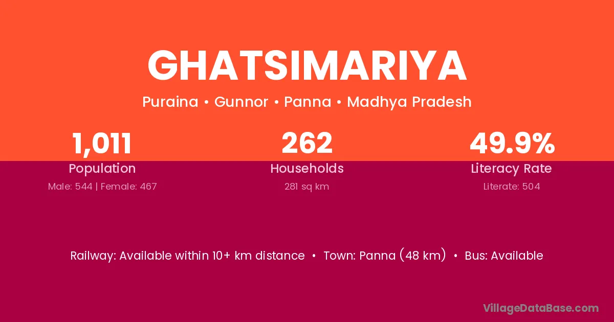 Panna (48 km) is the nearest town to Ghatsimariya village for major economic activities and is located approximately 48 km away.
