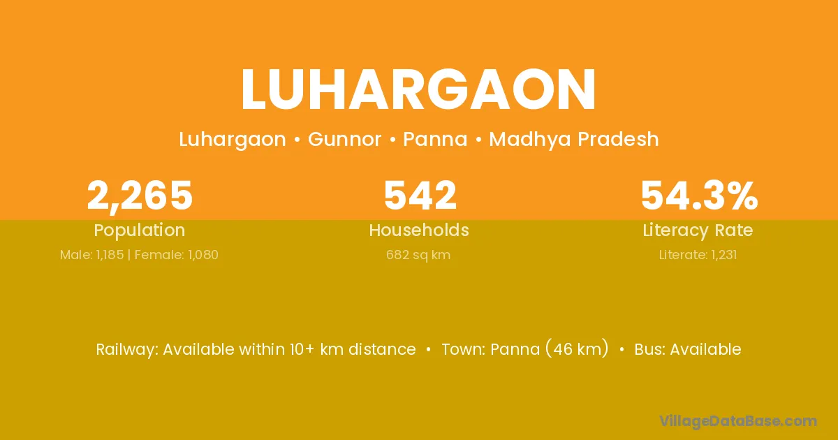 Panna (46 km) is the nearest town to Luhargaon village for major economic activities and is located approximately 46 km away.