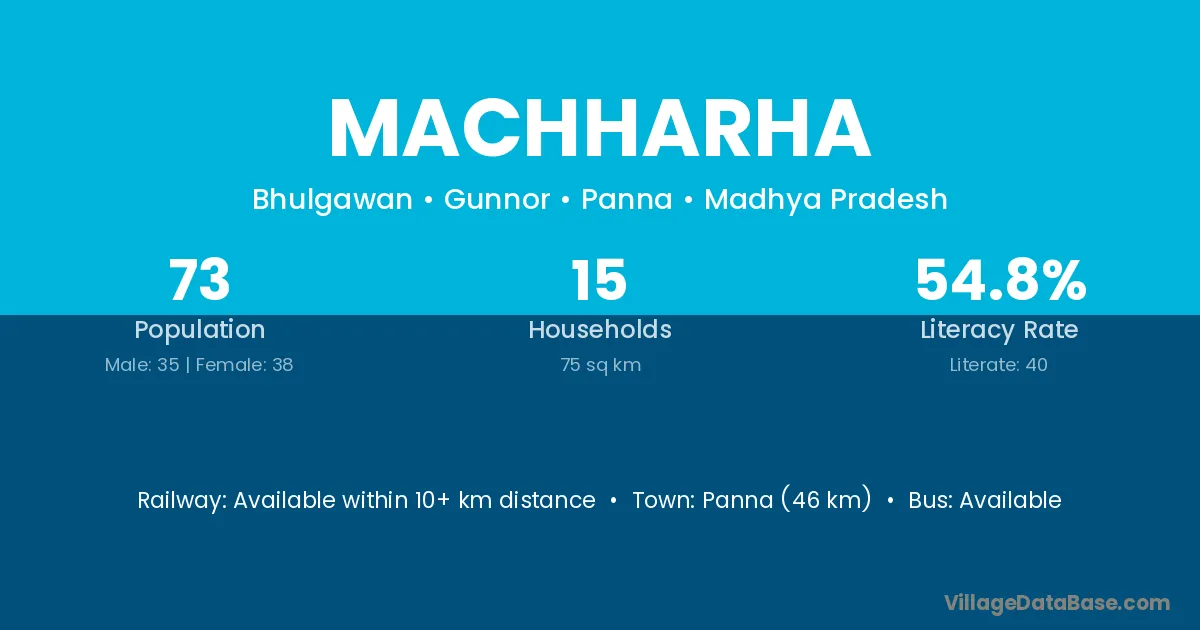 Panna (46 km) is the nearest town to Machharha village for major economic activities and is located approximately 46 km away.