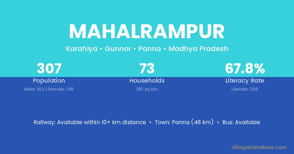 Panna (48 km) is the nearest town to Mahalrampur village for major economic activities and is located approximately 48 km away.