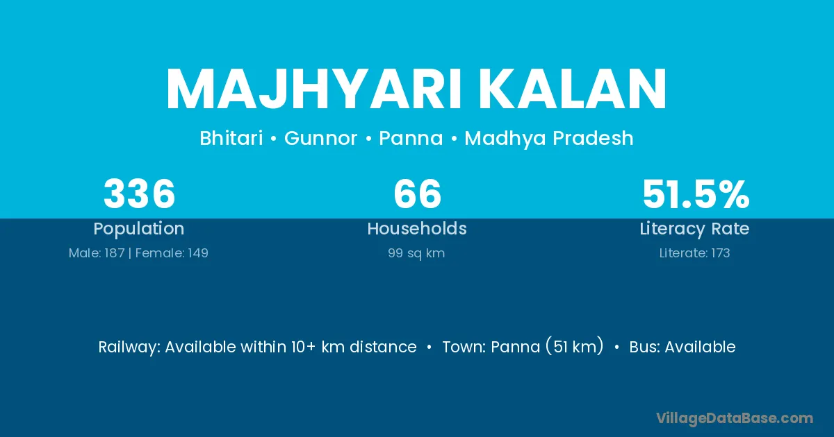 Panna (51 km) is the nearest town to Majhyari Kalan village for major economic activities and is located approximately 51 km away.