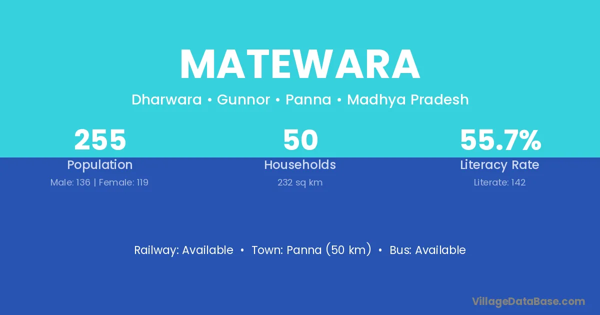 Panna (50 km) is the nearest town to Matewara village for major economic activities and is located approximately 50 km away.