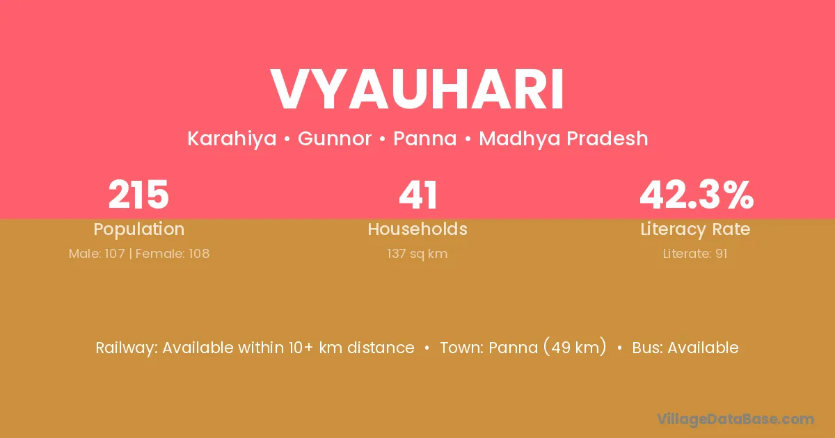Vyauhari village has a total population of 215 people, of which 107 are males and 108 are females.