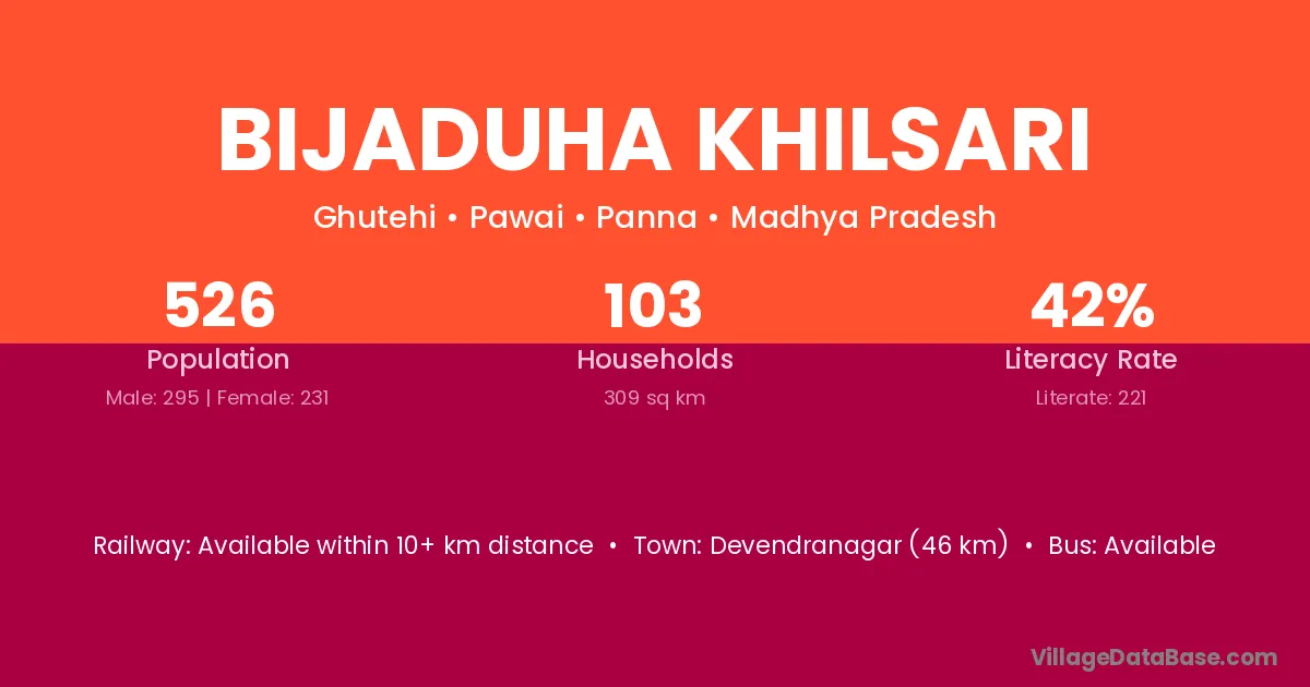 Bijaduha Khilsari village has a total population of 526 people, of which 295 are males and 231 are females.