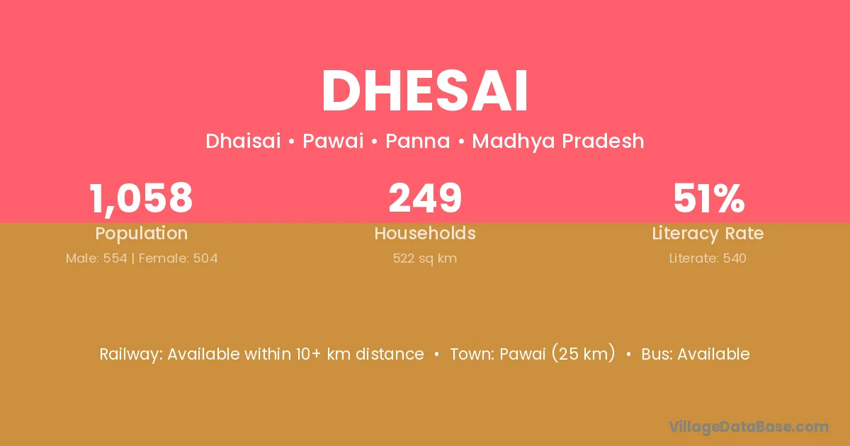 Pawai (25 km) is the nearest town to Dhesai village for major economic activities and is located approximately 25 km away.