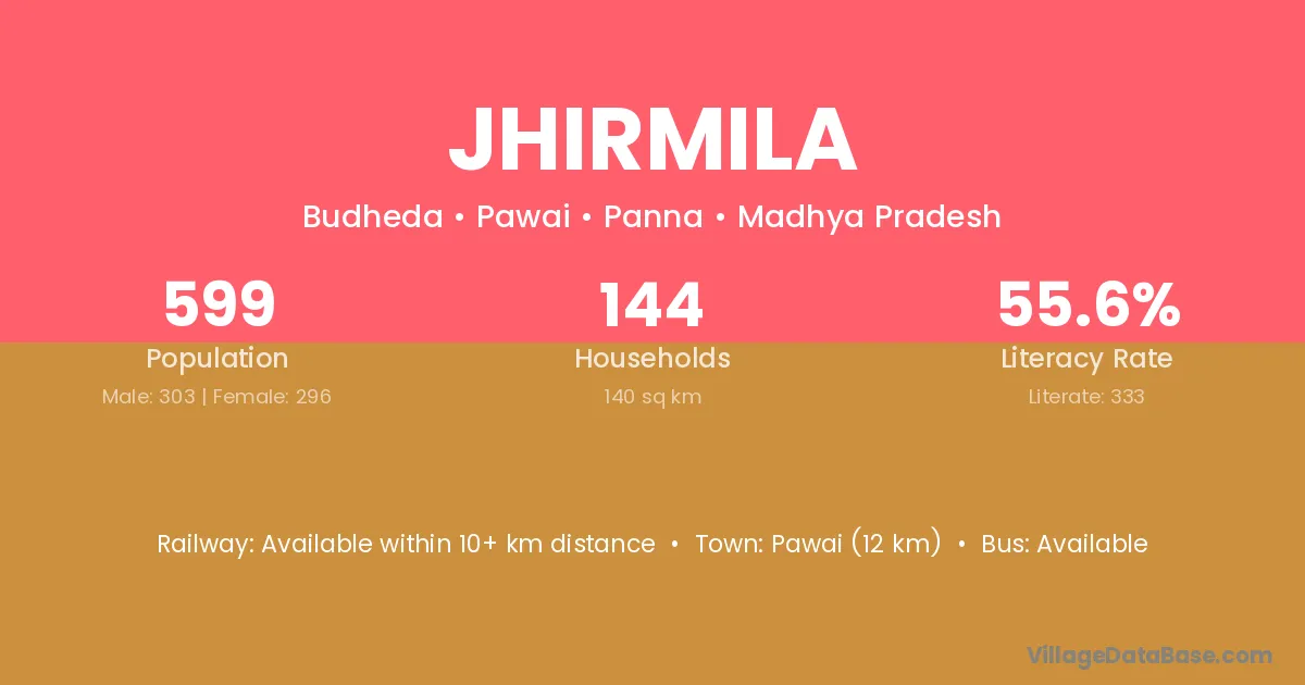 Jhirmila village has a total population of 599 people, of which 303 are males and 296 are females.