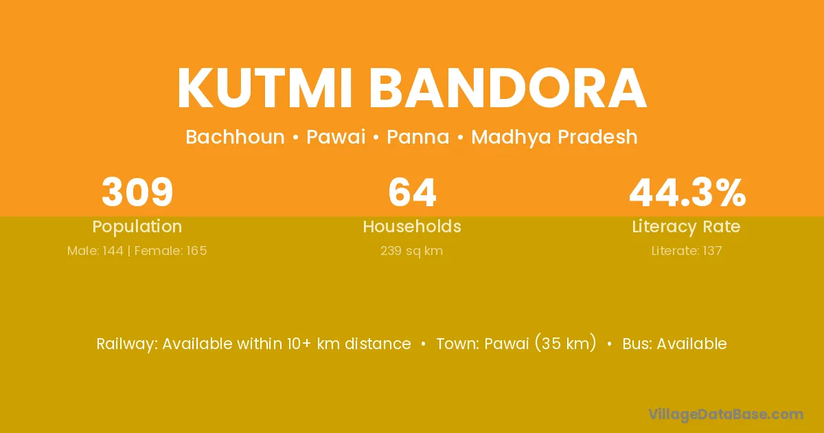 Kutmi Bandora village has a total population of 309 people, of which 144 are males and 165 are females.