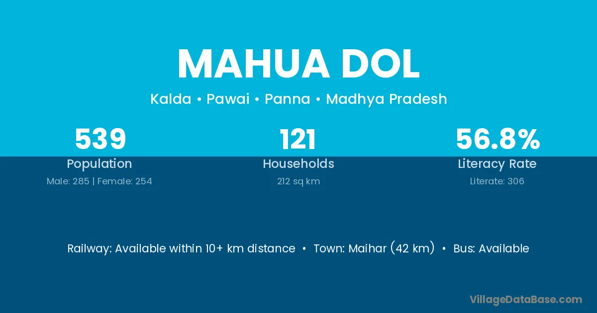 Maihar (42 km) is the nearest town to Mahua Dol village for major economic activities and is located approximately 42 km away.