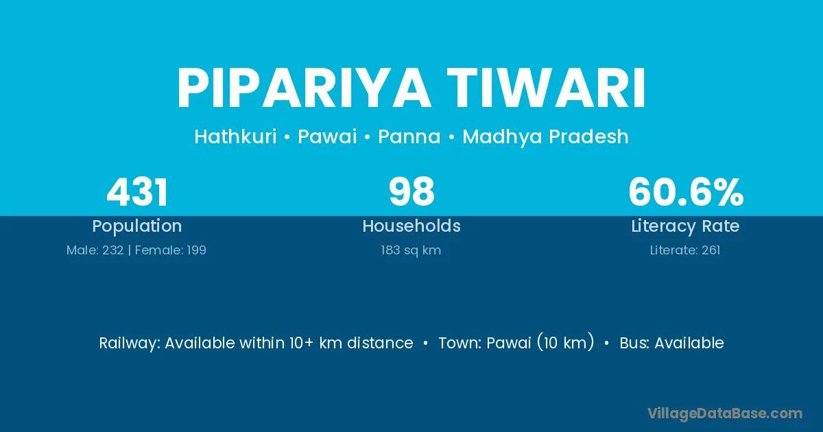 Pipariya Tiwari village has a total population of 431 people, of which 232 are males and 199 are females.