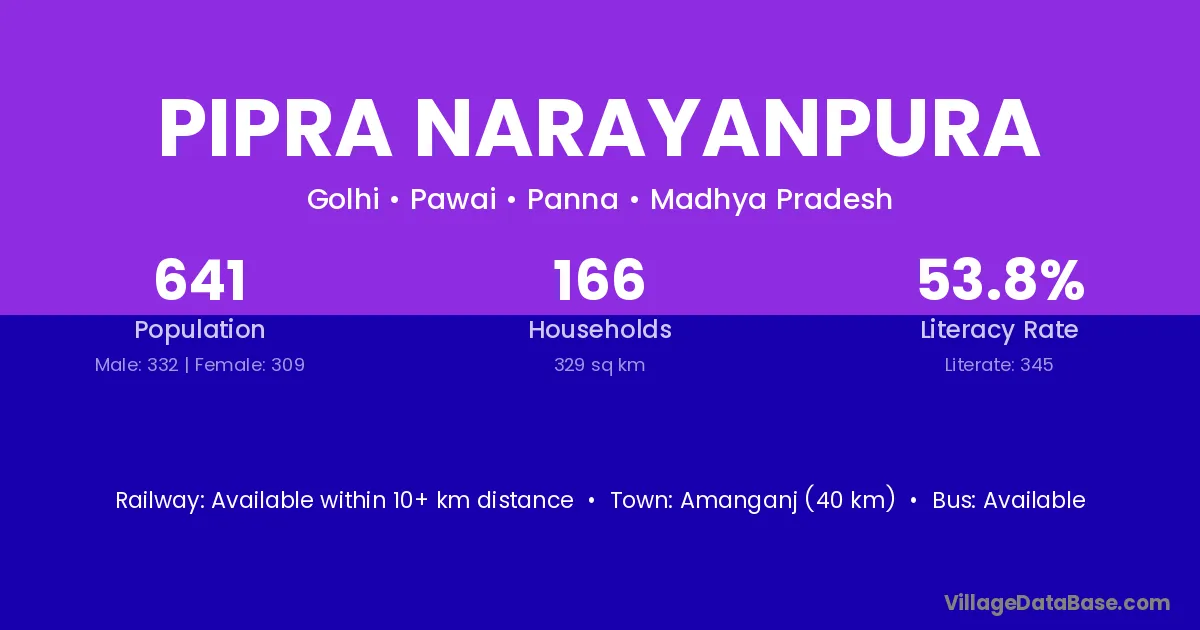 Amanganj (40 km) is the nearest town to Pipra Narayanpura village for major economic activities and is located approximately 40 km away.