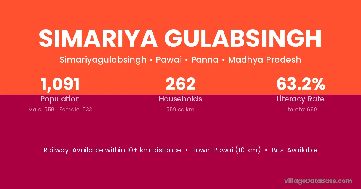 Simariya Gulabsingh village has a total population of 1,091 people, of which 558 are males and 533 are females.