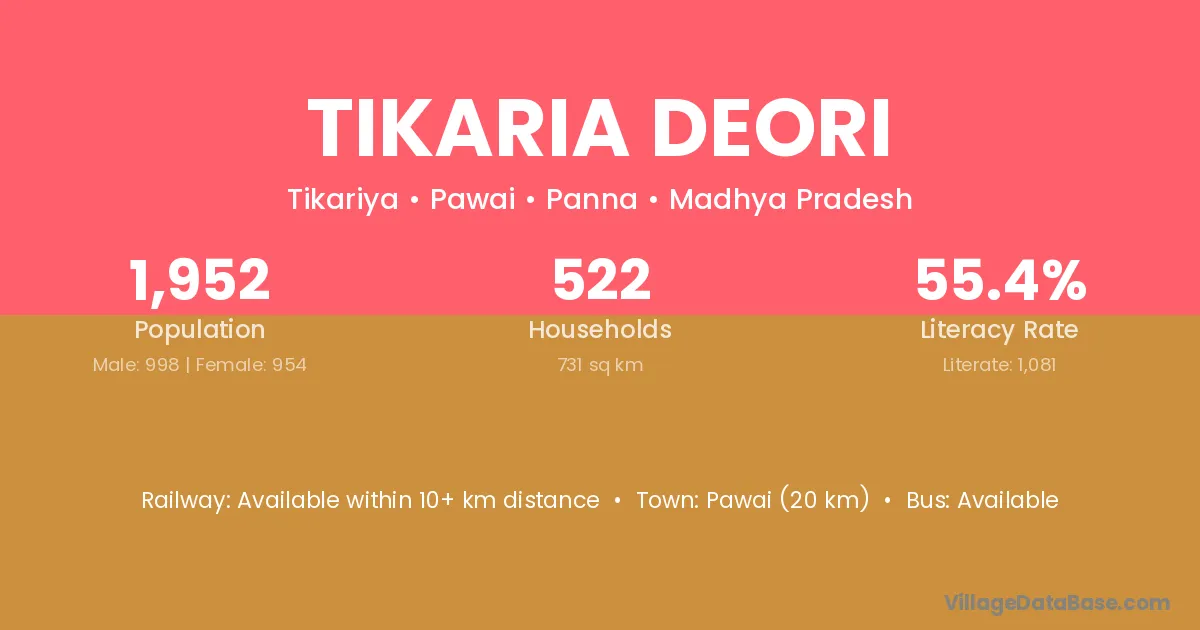 Tikaria Deori village has a total population of 1,952 people, of which 998 are males and 954 are females.