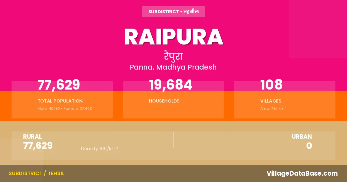 According to the 2011 census The total area of Raipura Tehsil is 730 km², with a population of 77629 people. The population density is 106 inhabitants per square kilometre, and there are approximately 19684 houses in the sub district.