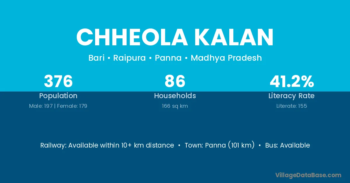 Panna (101 km) is the nearest town to Chheola Kalan village for major economic activities and is located approximately 101 km away.