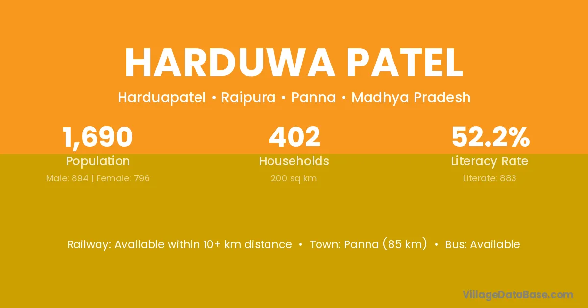 Panna (85 km) is the nearest town to Harduwa Patel village for major economic activities and is located approximately 85 km away.