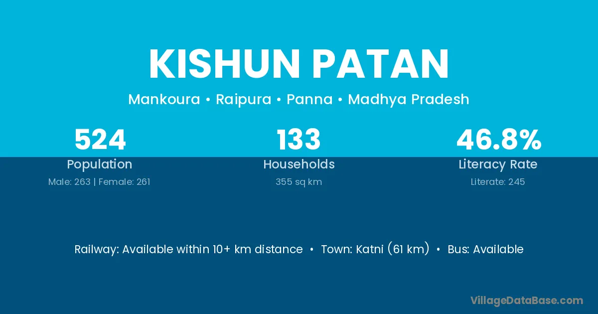 Katni (61 km) is the nearest town to Kishun Patan village for major economic activities and is located approximately 61 km away.