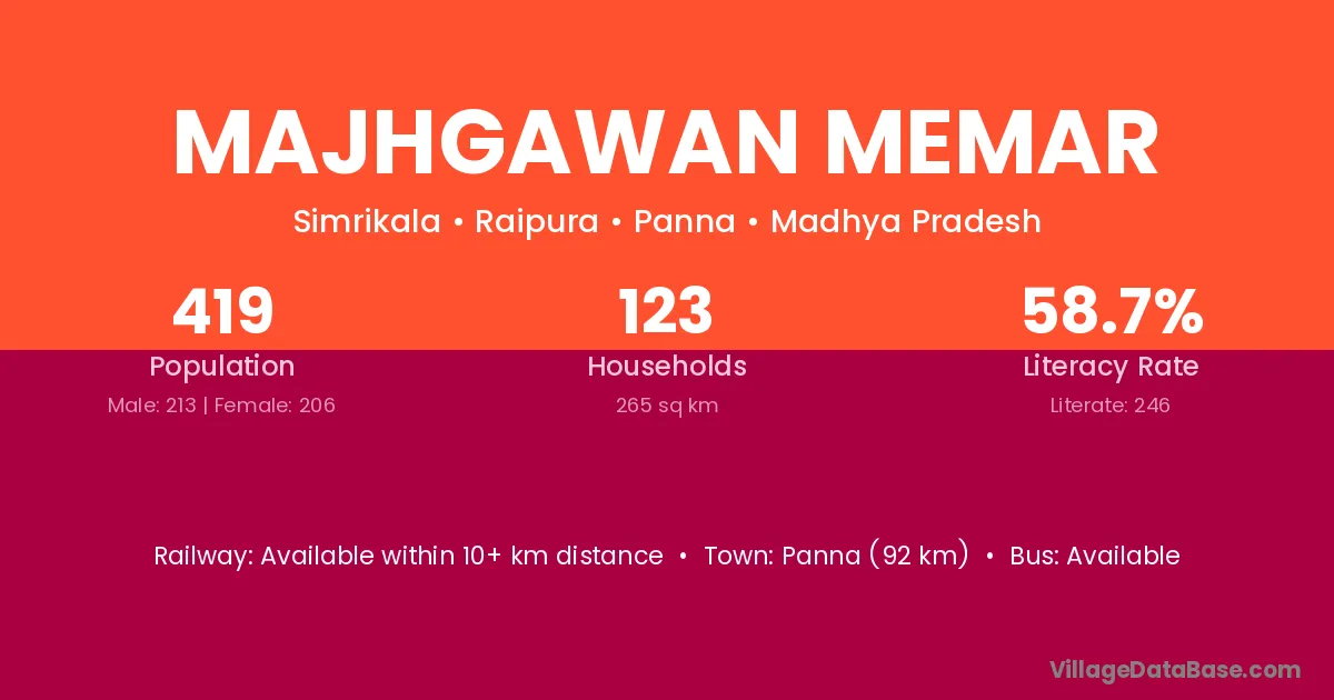 Panna (92 km) is the nearest town to Majhgawan Memar village for major economic activities and is located approximately 92 km away.