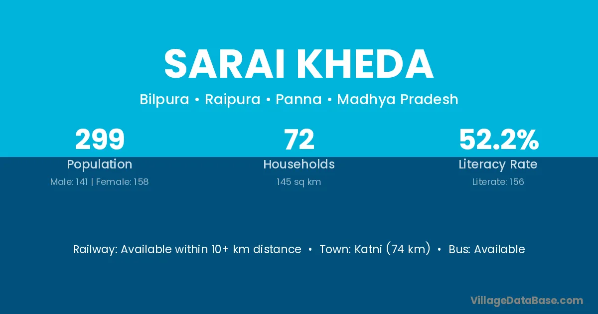 Katni (74 km) is the nearest town to Sarai Kheda village for major economic activities and is located approximately 74 km away.