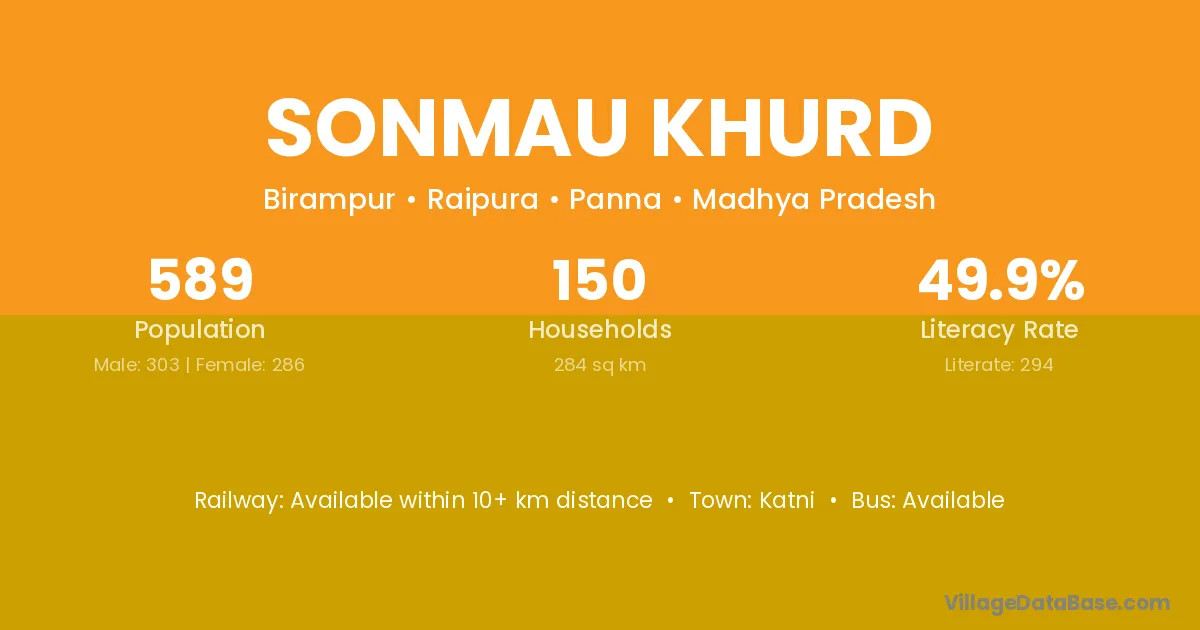 Sonmau Khurd village has a total population of 589 people, of which 303 are males and 286 are females.