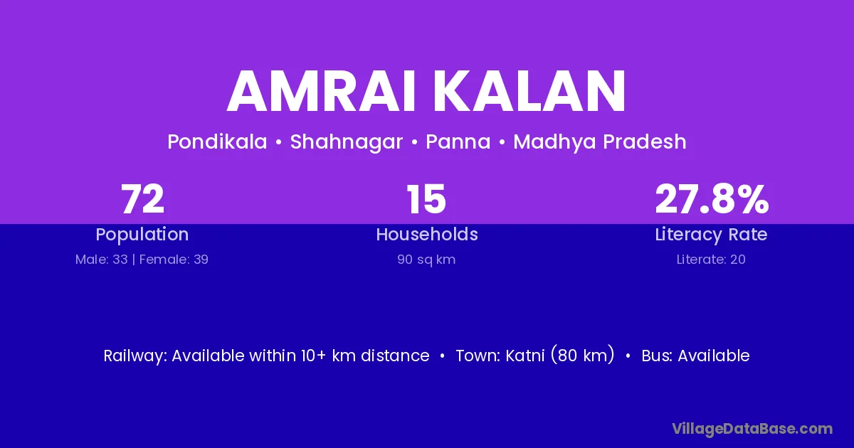 Katni (80 km) is the nearest town to Amrai Kalan village for major economic activities and is located approximately 80 km away.