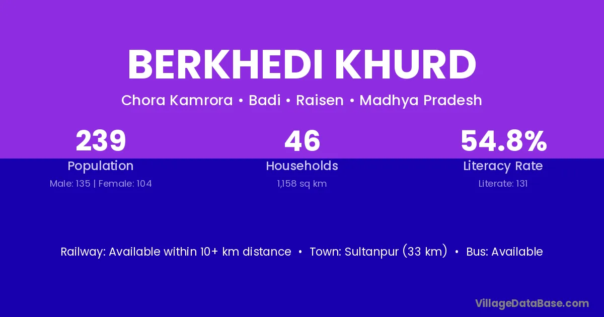 Sultanpur (33 km) is the nearest town to Berkhedi Khurd village for major economic activities and is located approximately 33 km away.