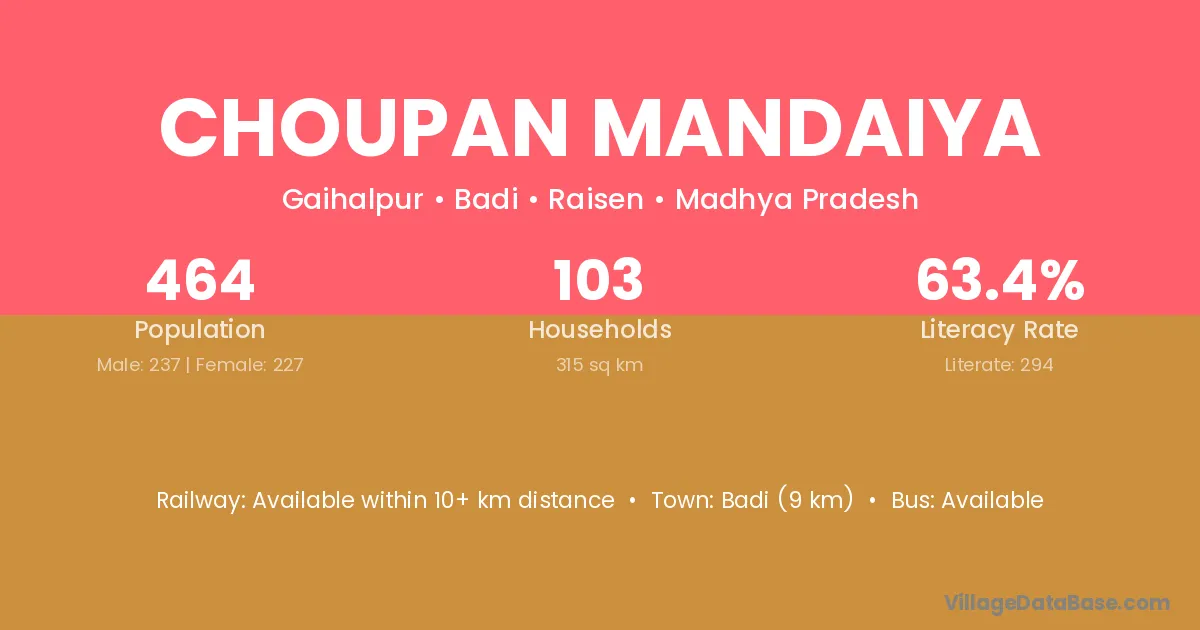 Choupan Mandaiya village has a total population of 464 people, of which 237 are males and 227 are females.