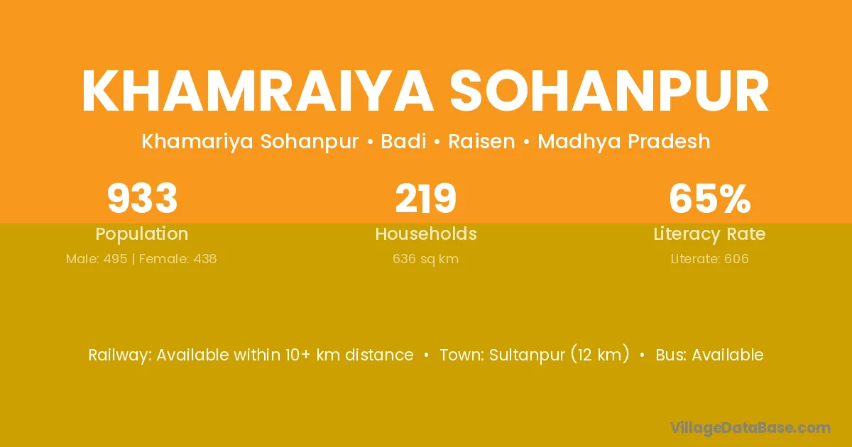 Sultanpur (12 km) is the nearest town to Khamraiya Sohanpur village for major economic activities and is located approximately 12 km away.