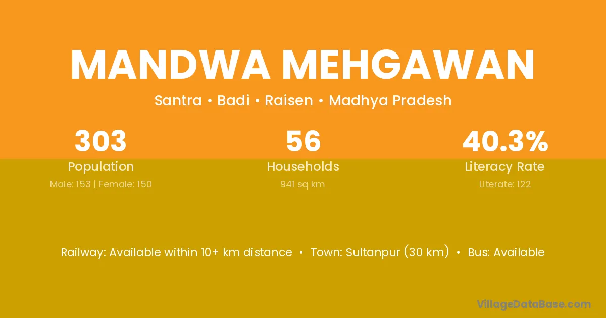 Sultanpur (30 km) is the nearest town to Mandwa Mehgawan village for major economic activities and is located approximately 30 km away.