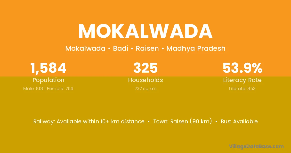 Raisen (90 km) is the nearest town to Mokalwada village for major economic activities and is located approximately 90 km away.