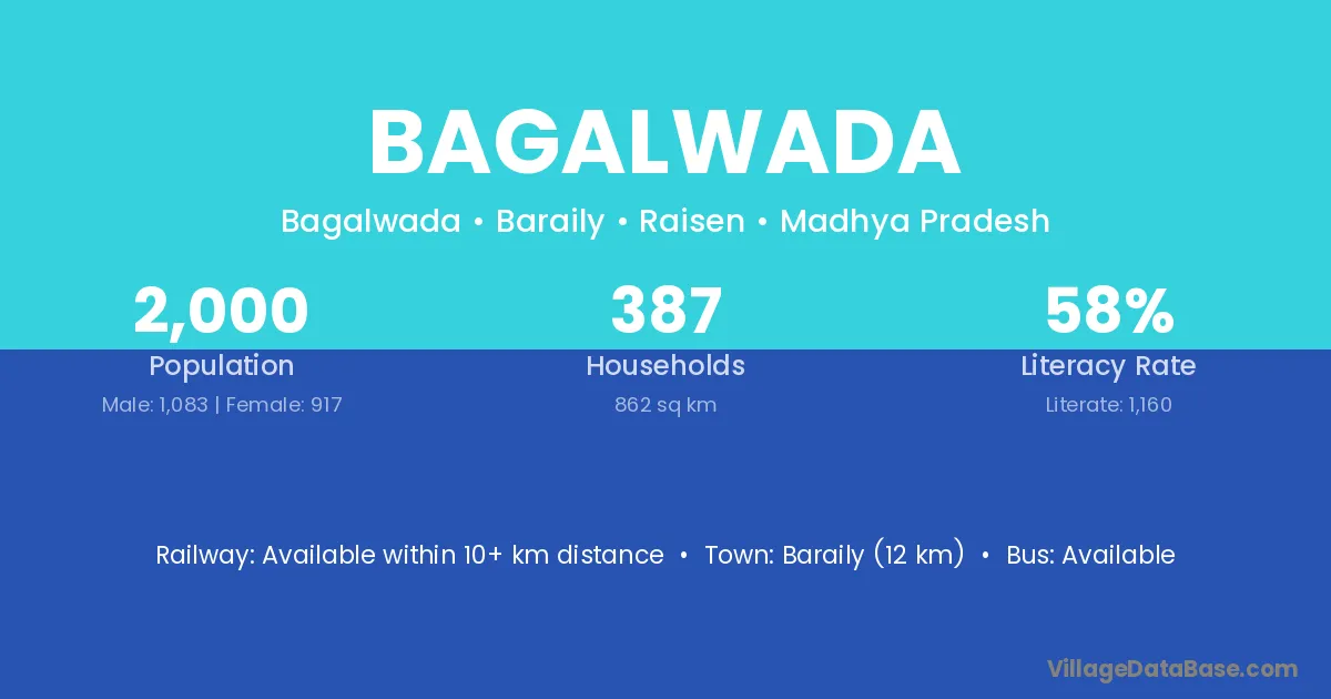 Baraily (12 km) is the nearest town to Bagalwada village for major economic activities and is located approximately 12 km away.