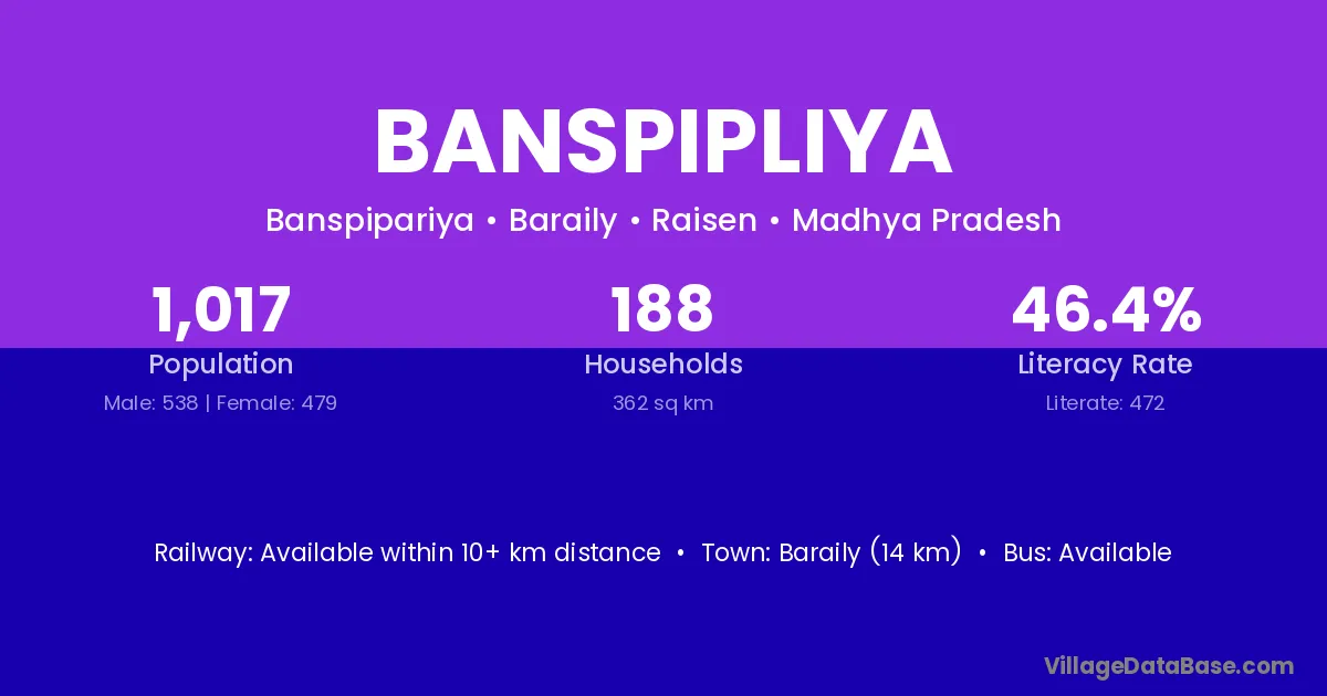 Baraily (14 km) is the nearest town to Banspipliya village for major economic activities and is located approximately 14 km away.