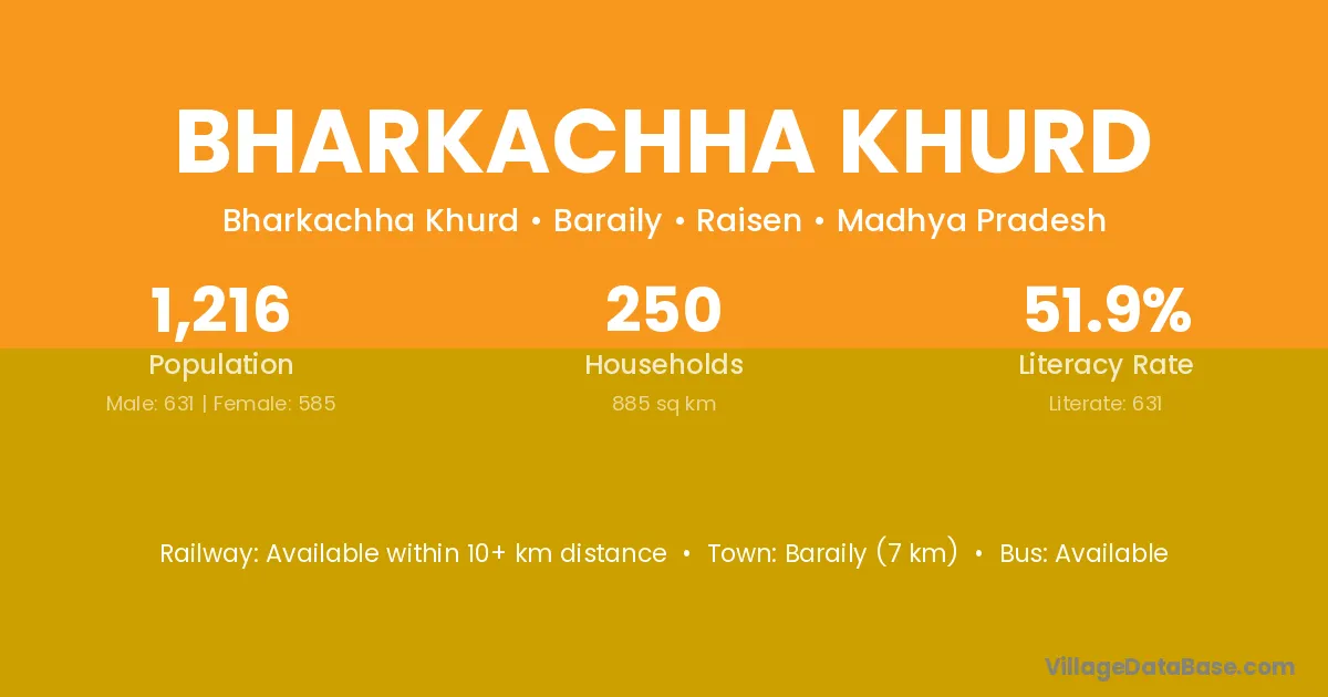Bharkachha Khurd village has a total population of 1,216 people, of which 631 are males and 585 are females.