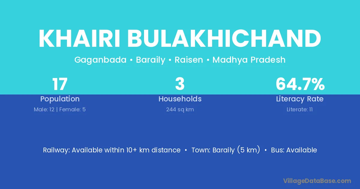 Baraily (5 km) is the nearest town to Khairi Bulakhichand village for major economic activities and is located approximately 5 km away.
